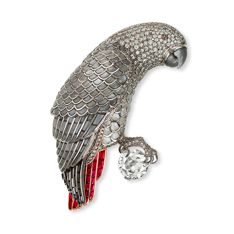 Die Graupapageien-Brosche aus dem Jahr 1997 zeigt einen historischen Diamanten von über 13,5 ct in den Krallen des Vogels.